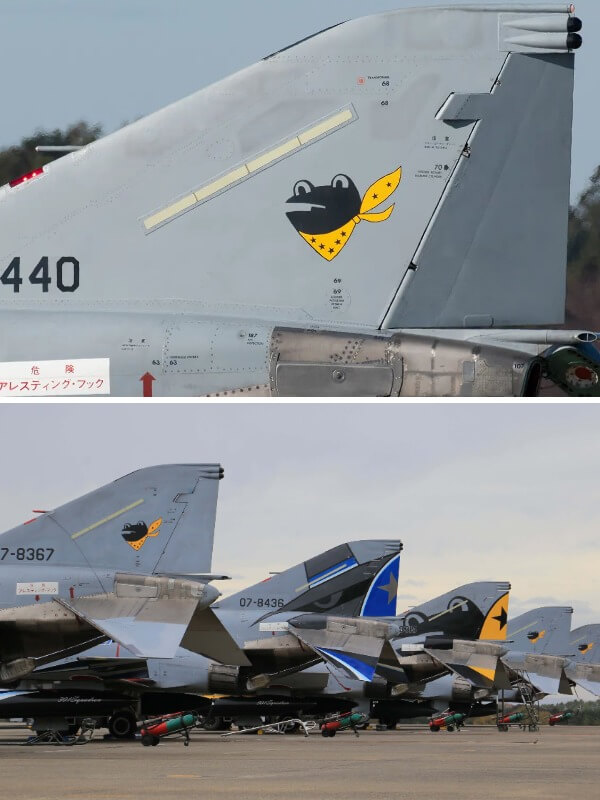 Логотип эскадрильи (лягушка) расположен у отметки на 6 часов, иероглиф «Kai» на отметке 12 часов. Phantom II 4EJ/Kai, модернизация и производство Mitsubishi Heavy Industries для Воздушных сил самообороны Японии (JASDF).