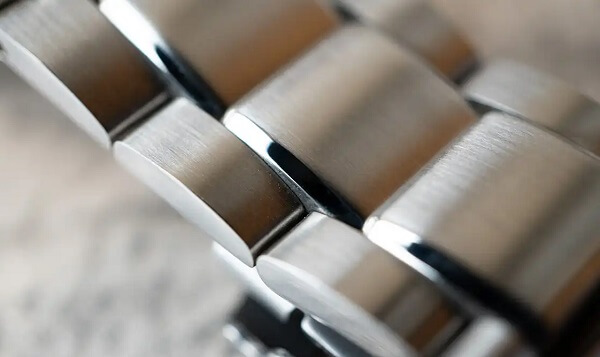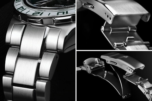 Плотный трёхрядный браслет имеет продольное сатинирование, при этом центральные грани внутреннего звена имеют зеркальную полировку. Обладая визуальным весом, создаёт целостность с мощным корпусом, смотрится изящно и хорошо.