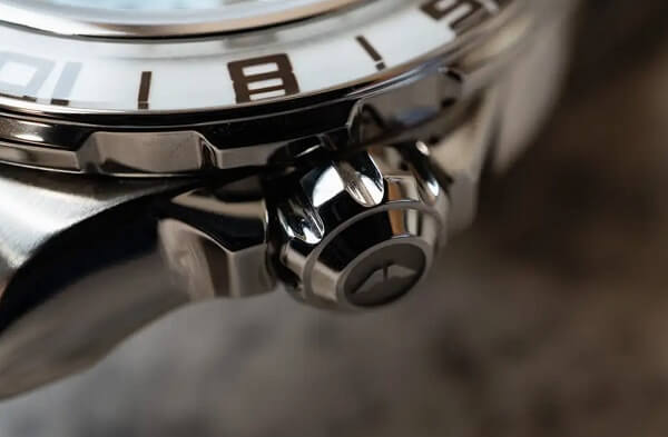 Крупная завинчивающаяся часовая головка имеет форму двухуровневого усечённого конуса. На торце объёмное изображение логотипа компании. Интегрирована в корпус и защищена боковыми стойками.