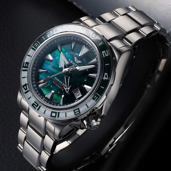 Перламутровые часы изумрудно-зелёного оттенка. Стрелки/индексы стальные с белым люминесцентым составом. Ограниченная серия в 199 экземпляров, цена - 129.800 японских иен (без учета налога 118.000 иен).