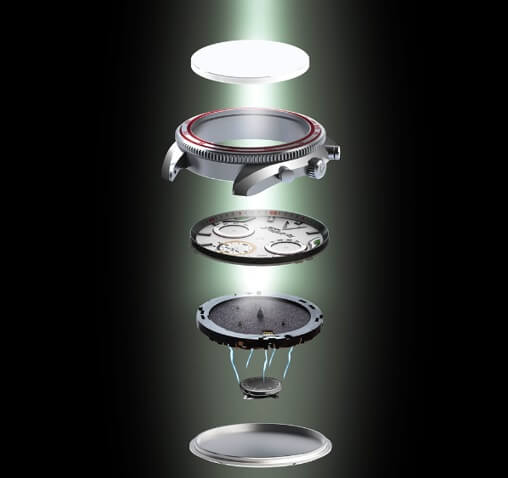 Часы работают на солнечной энергии. Под циферблатом находится солнечная панель из аморфного кремния, которая преобразует свет в электрическую энергию и накапливает энергию во вторичной батарее (аккумуляторе).