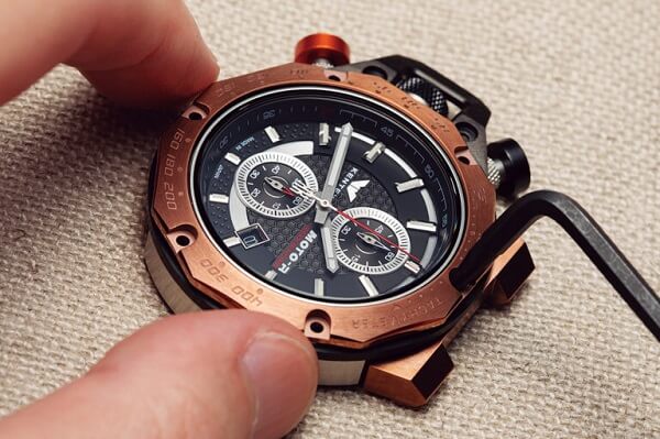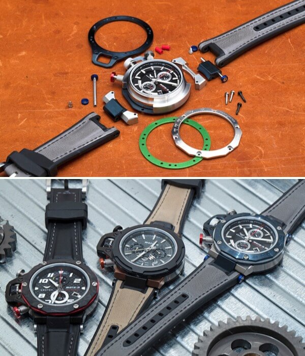 Подобно мотоциклу, допускающему последующую модернизацию, часы Moto-R имеют модульную конструкцию, состоящую из 16 элементов, зафиксированных между собой винтовым соединением. Такая архитектура позволяет свободно комбинировать и формировать детализацию: Вы не просто приобретаете готовые часы, а выступаете в роли дизайнера-оформителя.