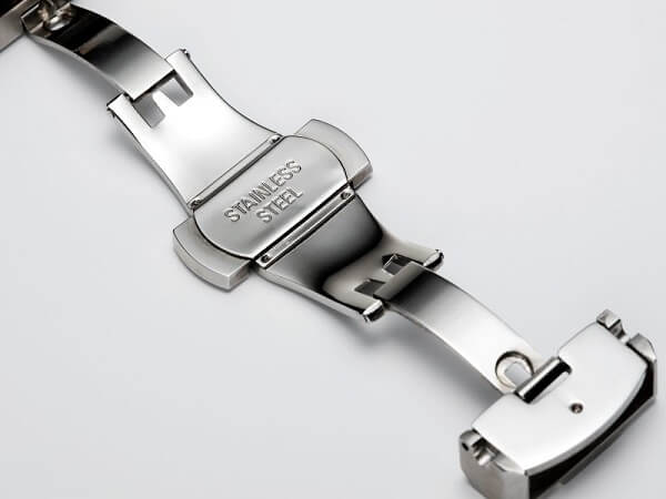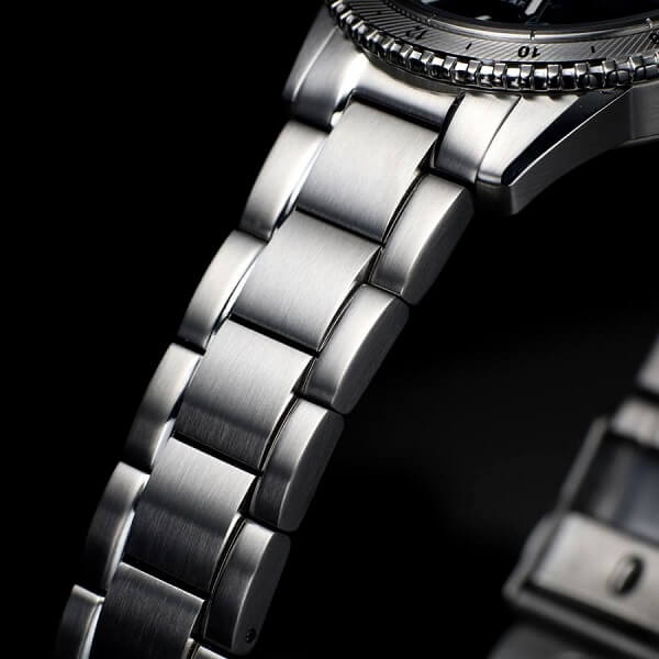 Технологичный и удобный браслет, шириной 22 мм с сужением на 18 мм, изготовлен из трех плотно подогнанных звеньев, имеющих сатинированную отделку и зеркальные грани по внутреннему звену. Используется японская сталь SUS316L, что гарантирует надежность и долговечность.
