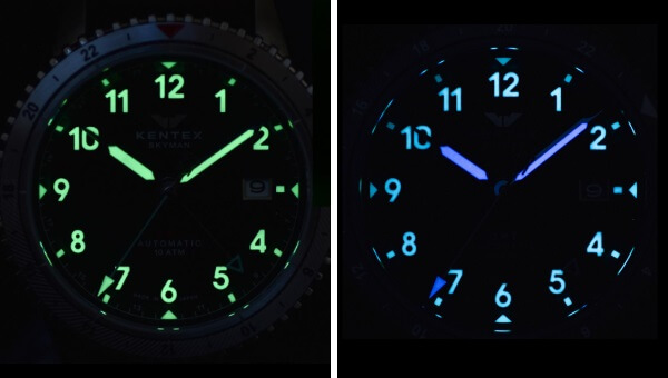 Индексы и крупные стрелки, как положено для пилотских часов, щедро покрыты люминесцентной краской, ярко проявляющейся в глубокой темноте. Модели с зелёным циферблатом использует зелёную люминесценцию, остальные синюю в разной тональности.