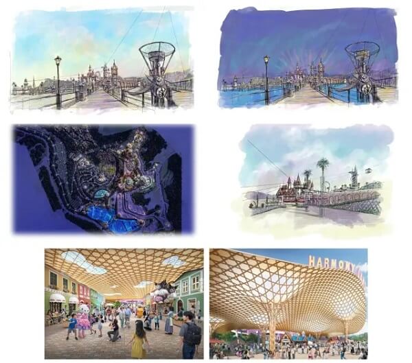 Harmonyland находится на склоне холма, и создатели планируют развить эту особенность: новый курорт будет напоминать «воздушный парк аттракционов». Среди уже озвученных элементов проекта: