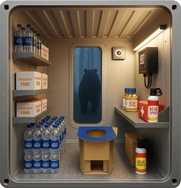 Японская компания Jacacon представила новое средство индивидуальной и коллективной защиты — контейнер Life Shield, но есть и более простое название - Kumacon, или «медвежий контейнер». Это переработанный морской грузовой контейнер, усиленный и оборудованный для пережидания нападения дикого животного.