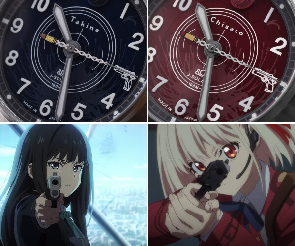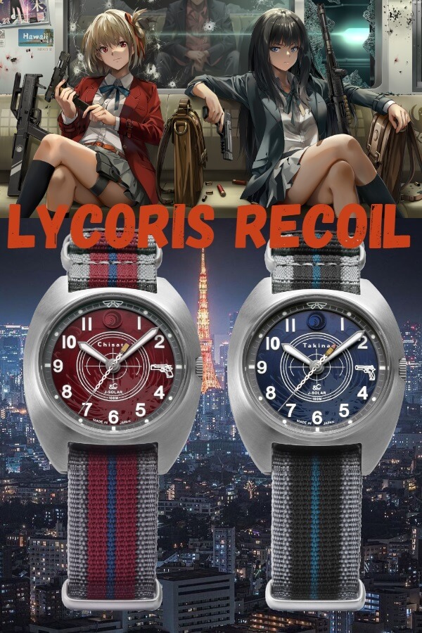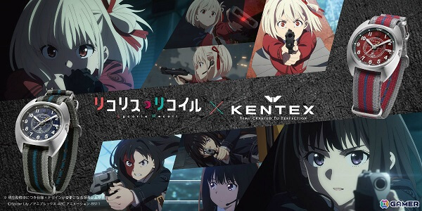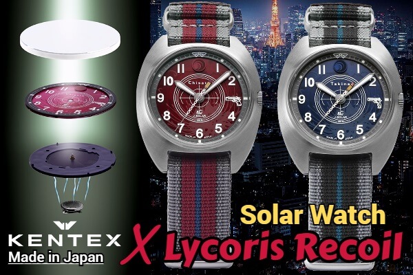 Совместный проект японской часовой компании Kentex Japan и аниме сериала «Lycoris Recoil». В рамках партнерства выпущены две модели на солнечной энергии в цветах главных героев девушек Chisato и Takina. Прекрасно подойдут как парные наручные часы для подружек.