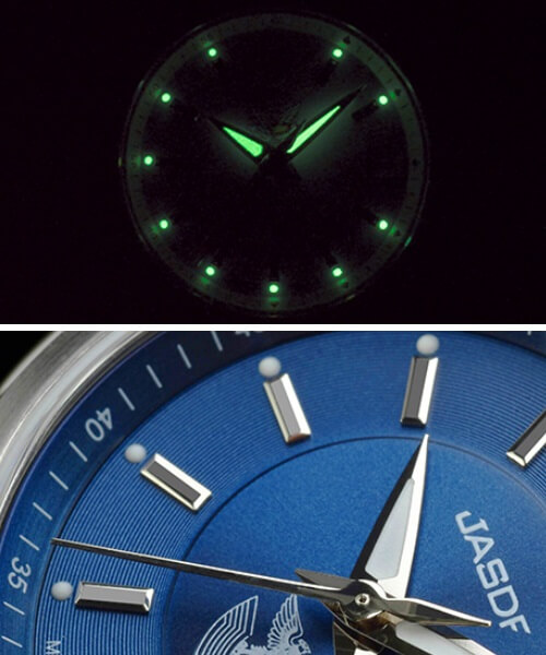 Для улучшения видимости в вечернее время по окружности размещены дополнительные светящиеся объемные круглые метки. Часовая/минутная стрелка имеют покрытие ярким зелёным светонакопителем.